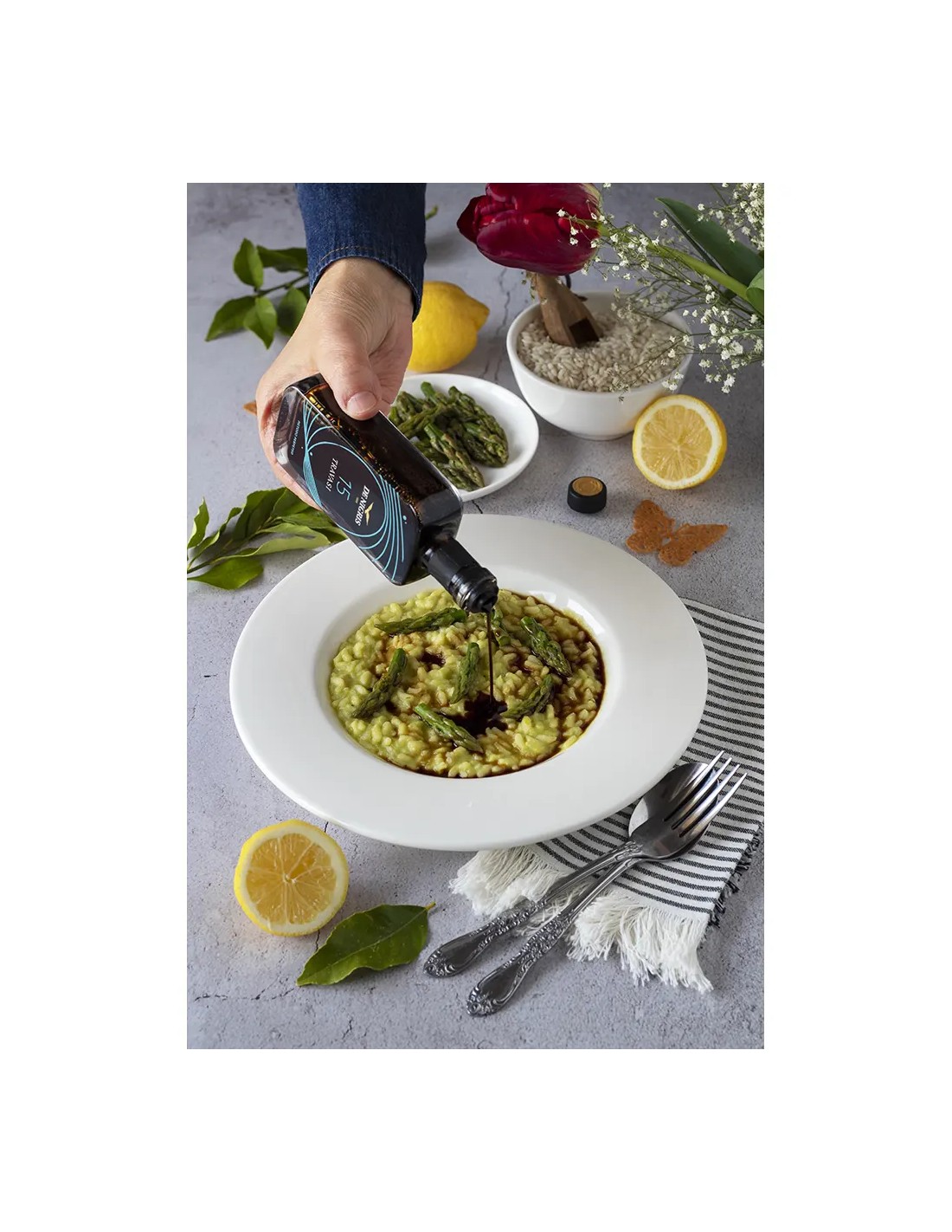 Versatile und raffiniert ist dieser Balsamico eine authentische Darstellung italienischer Handwerkskunst, konzipiert, um jedes Gericht mit Klasse und Harmonie zu verbessern.