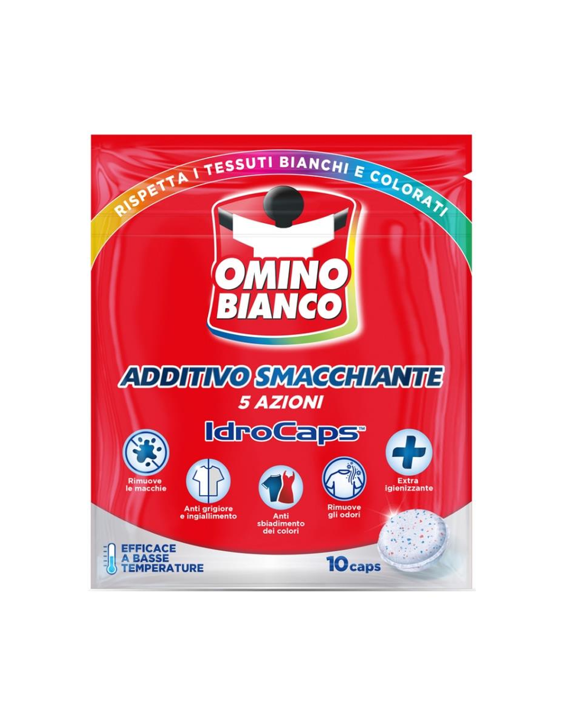 Entdecken Sie die neue konzentrierte Formel von Omino Bianco IdroCaps, das Fleckenentferner-Additiv, das Ihre Kleidung effektiv reinigt und desinfiziert. Die HydroCaps sind so konzipiert, dass sie auch bei niedrigen Temperaturen funktionieren und tadellose Ergebnisse auf allen Stoffen gewährleisten. Ideal für diejenigen, die eine kraftvolle, aber dennoch schonende Lösung für die Fasern suchen.