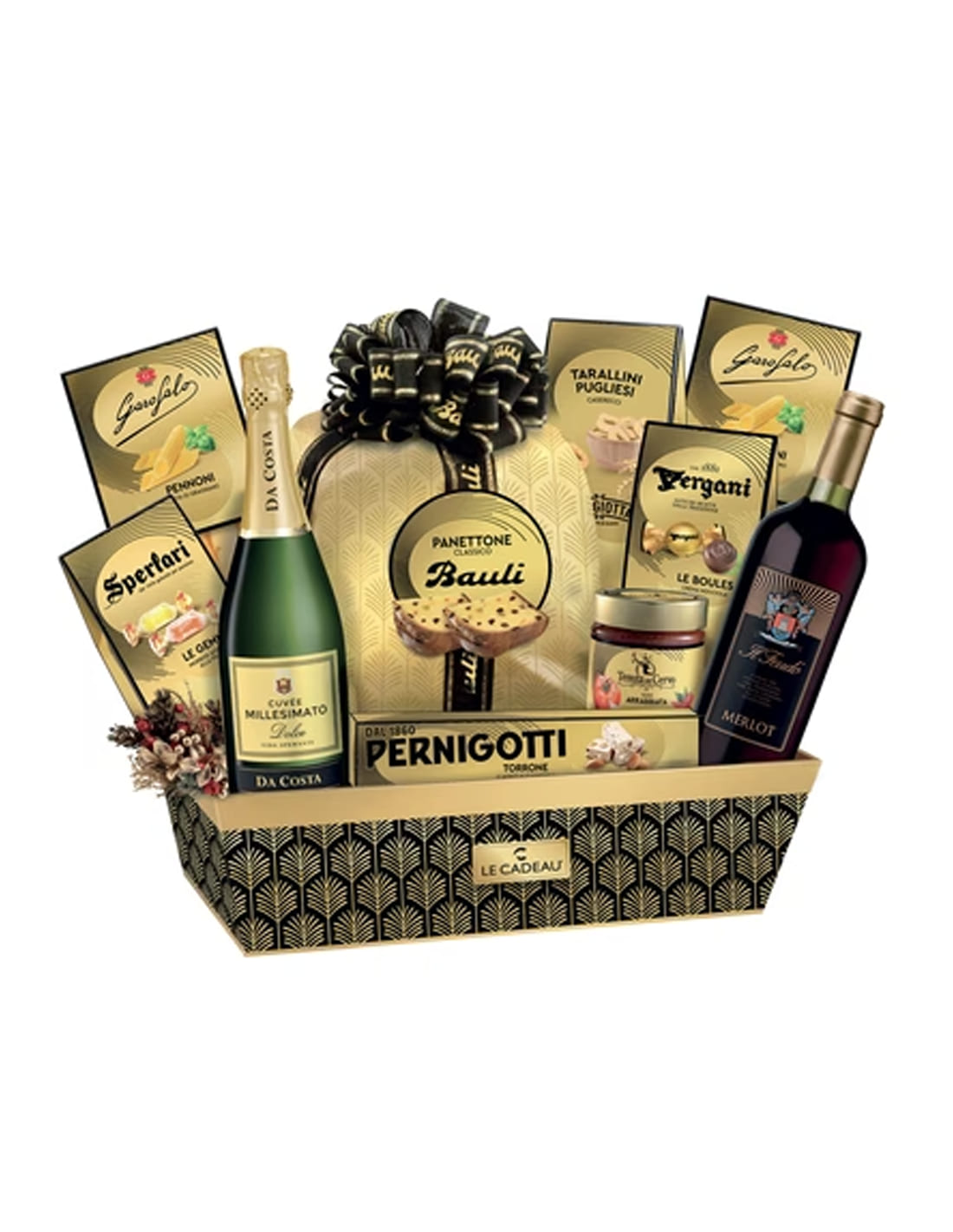 Vergoldetes Schwarz Bedrucktes Tablett - Bauli Handverpackter Panettone 700 g - Flasche Da Costa Süßer Sekt Jahrgang 9,5 % vol. - 750 ml - Flasche Il Feudo Merlot Wein 11 % vol. - 750 ml - Schachtel Pernigotti Weiche Mandelnougat 75 g - Packung Vergani Milchschokoladenkugeln mit Haselnusscremefüllung 75 g - Packung Sperlari Weiche Fruchtgelees 100 g - 2 Packungen Garofalo Rigatoncini Pasta 250 g - Glas Tenuta del Cervo Arrabbiata Sauce 190 g - Packung Margiotta Klassische Tarallini 100 g