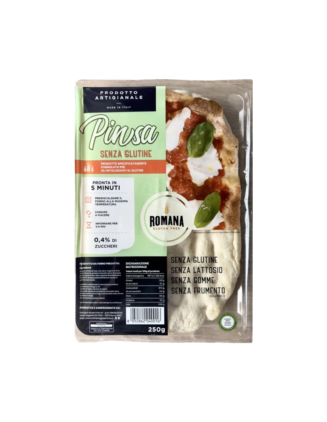 Discover the versatility of Romana's Gluten-Free Pinsa Romana, an ideal base to explore a variety of flavors. Perfect for a quick dinner, try adding seasonal ingredients to make a different dinner each time: in autumn, for example, experiment with tasty mushrooms and smoked scamorza cheese. For a touch of spring freshness, top your pinsa with asparagus and a sprinkle of Parmesan. Remember to serve it hot, maybe accompanied by a fresh green salad or a mixture of arugula and Parmesan, for a light yet satisfying meal. Dive into the pleasure of a delicious and hassle-free gluten-free dinner!Nutritional Values
