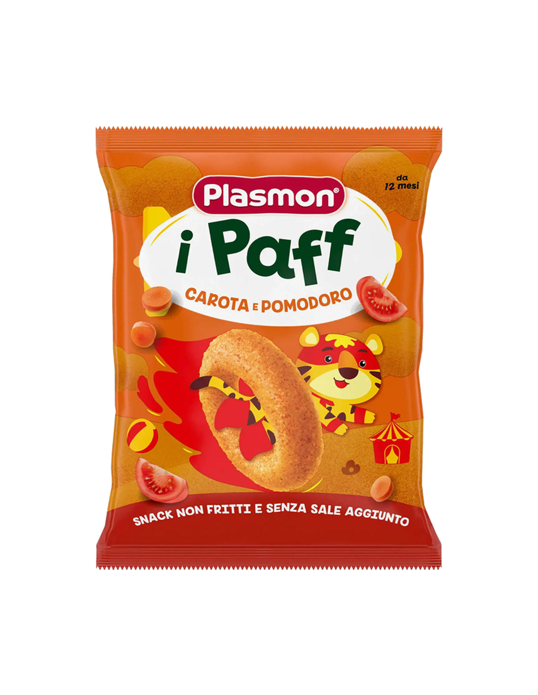 For a tasty and fun snack, try combining Plasmon's Paff Snacks with a natural yogurt cream: the neutral sweetness of the yogurt will enhance the fruity flavor of carrot and tomato, making snack time even more special. You can also crumble them over a fresh fruit salad to add a crunchy note. If you want a savory option, pair them with a soft spreadable cheese for a texture contrast that little ones will love. They are also great on their own as a quick snack during outdoor walks or car trips.Ingredients
