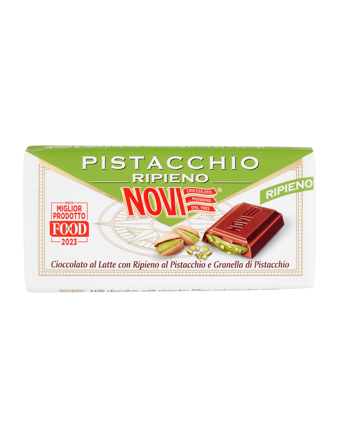 An irresistible chocolate bar that expertly blends the tradition and innovation of Novi. This delicious creation features a layer of Novi milk chocolate, with a very fine consistency, which harmonizes perfectly with a delicate and creamy pistachio filling. The deliciousness is further enhanced by the presence of crunchy chopped pistachios, giving a unique sensorial experience with every bite. Let yourself be conquered by this exquisite fusion of flavors and experience the emotion of savoring every single square, from start to finish.