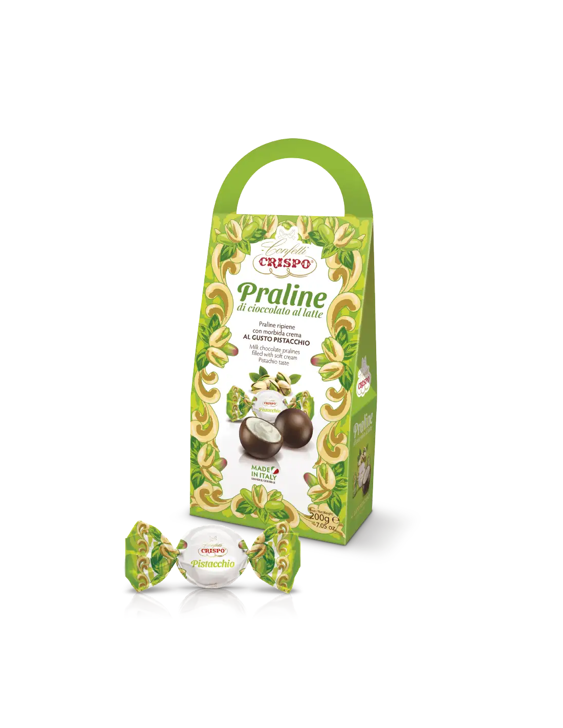 Enjoy the sweet taste of Milk Chocolate Pralines filled with pistachio by Crispo. These delicious pralines blend the softness of chocolate with the rich flavor of pistachio. Perfect for those looking for a sweet break during the day. The rich filling and quality chocolate make these pralines a perfect choice for any sweet tooth.