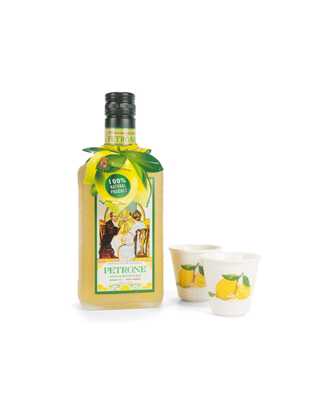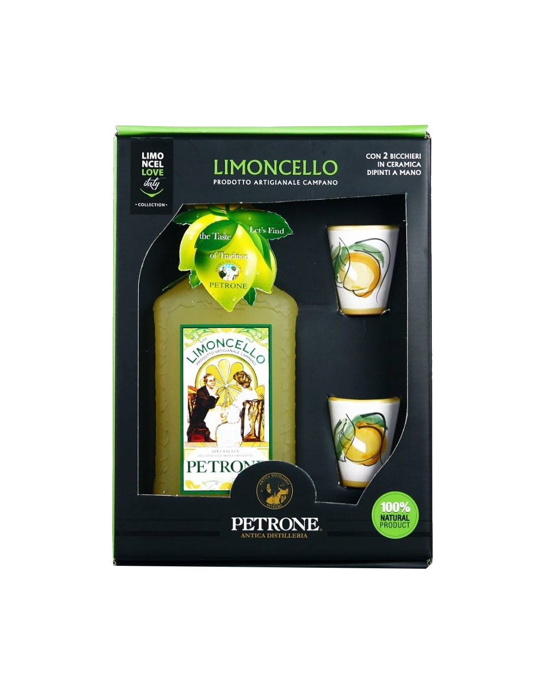 Limoncello from Antica Distilleria Petrone is a 100% natural, smooth and fresh artisanal liqueur, perfect for those seeking the authentic taste of the Amalfi Coast. This package comes with 2 finely crafted and hand-painted Vietri ceramic glasses, making it an impressive gift idea. Distilled following Italian tradition, this limoncello strikes the perfect balance between sweetness and acidity. It stands out for its intense aroma of freshly picked lemons, beckoning a relaxing sip after meals.