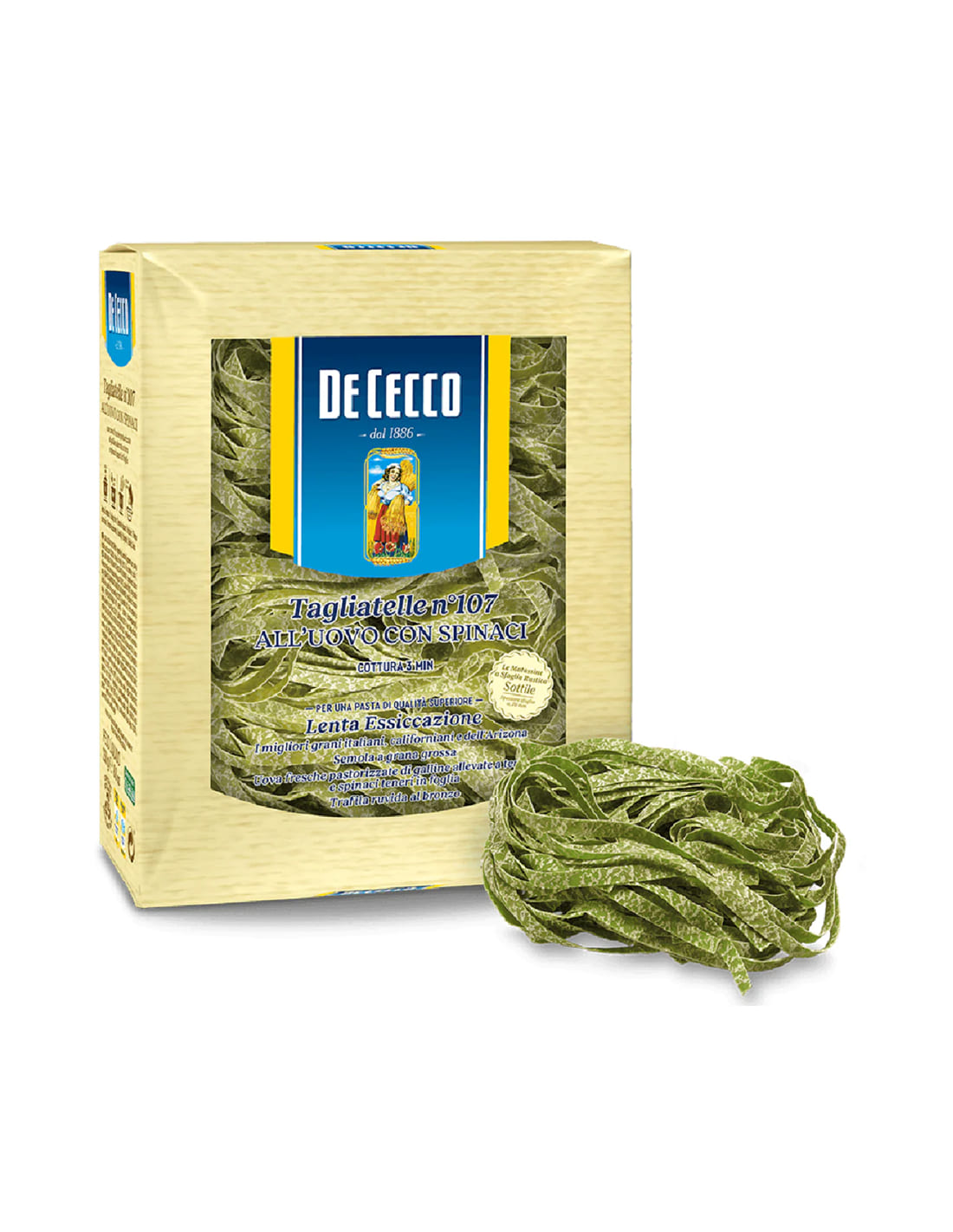 De Cecco Egg Tagliatelle with Spinach: a dish full of flavor and color. Their perfect texture captures every type of sauce. Made with fresh eggs and natural spinach, these tagliatelle stand out for their intense taste and unique softness. Ideal for those who love bold yet balanced flavors. Since 1886, De Cecco has been committed to making high-quality pasta using only the best ingredients.