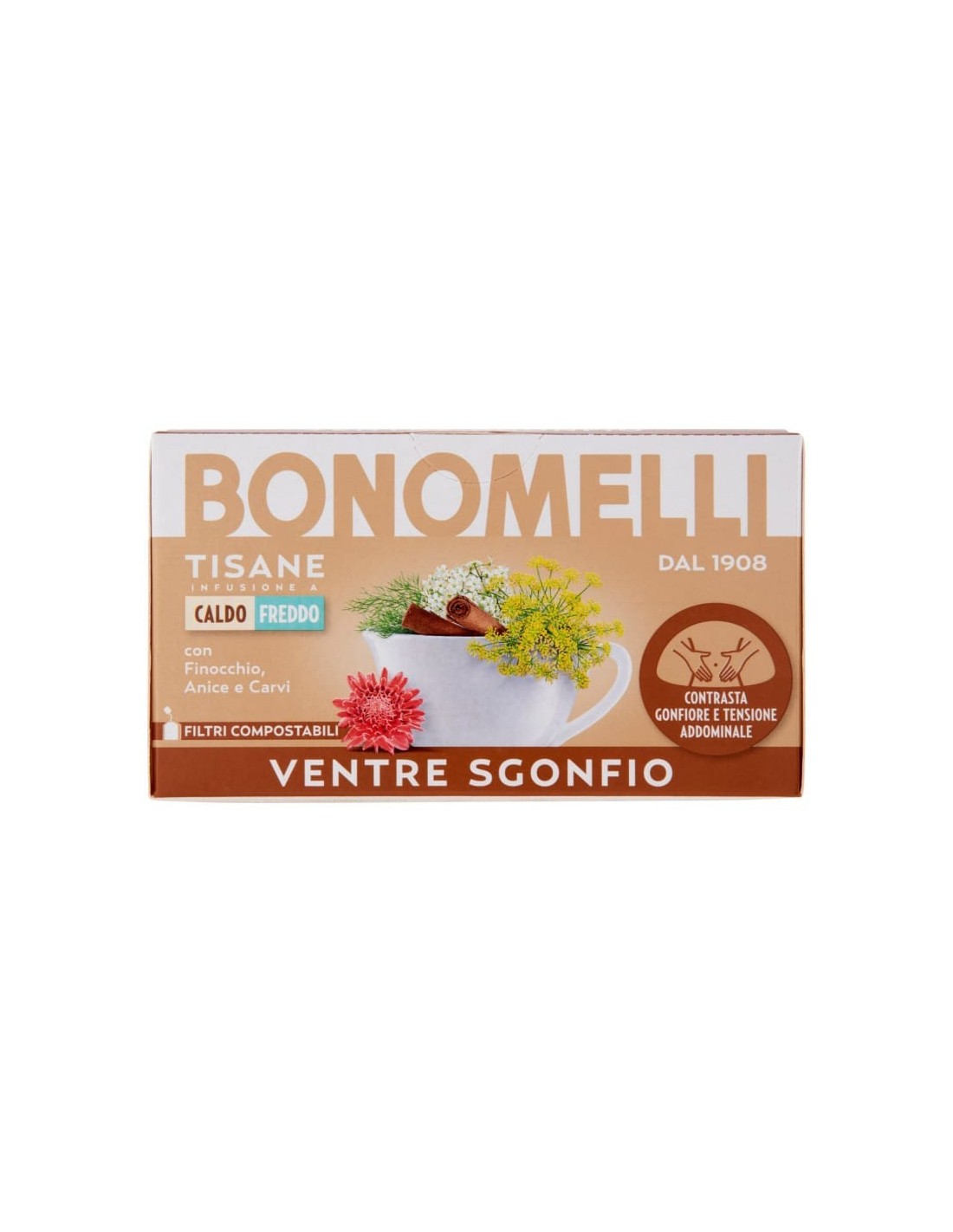 Bonomelli Tisana Ventre Sgonfio, known for its effectiveness in aiding digestion and reducing abdominal bloating. With its delicate and soothing aroma, it offers a moment of wellbeing with every sip. Perfect for those looking for a natural way to feel lighter and more comfortable. Ideal to enjoy after meals to optimize digestion or at any time of the day for a refreshing and calming break.