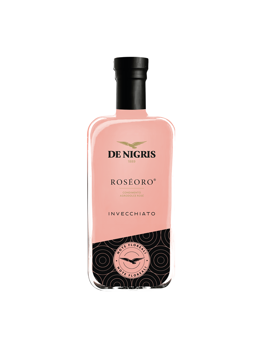 De Nigris Roséoro Aged – 250 ml is a sophisticated dressing made from carefully selected Ancellotta grapes, slowly cooked and aged in oak barrels. The result is a vinegar with a vibrant pink color, a fresh and delicate profile.