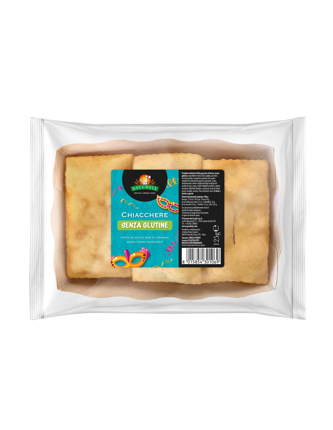 Chiacchiere sans gluten de Gecchele offrent le goût authentique des douceurs traditionnelles de Carnaval, parfaites pour ceux qui suivent un régime sans gluten. Avec une texture croquante et un doux équilibre des saveurs, elles satisfont l'envie d'une douceur maison et sûre pour les cœliaques. Ces chiacchiere conservent toutes les caractéristiques de l'originale, mais sont spécialement formulées pour être appréciées par tous. Gecchele jouit d'une solide réputation pour la production de produits sans gluten de haute qualité, tout en maintenant le goût authentique de la tradition pâtissière italienne.