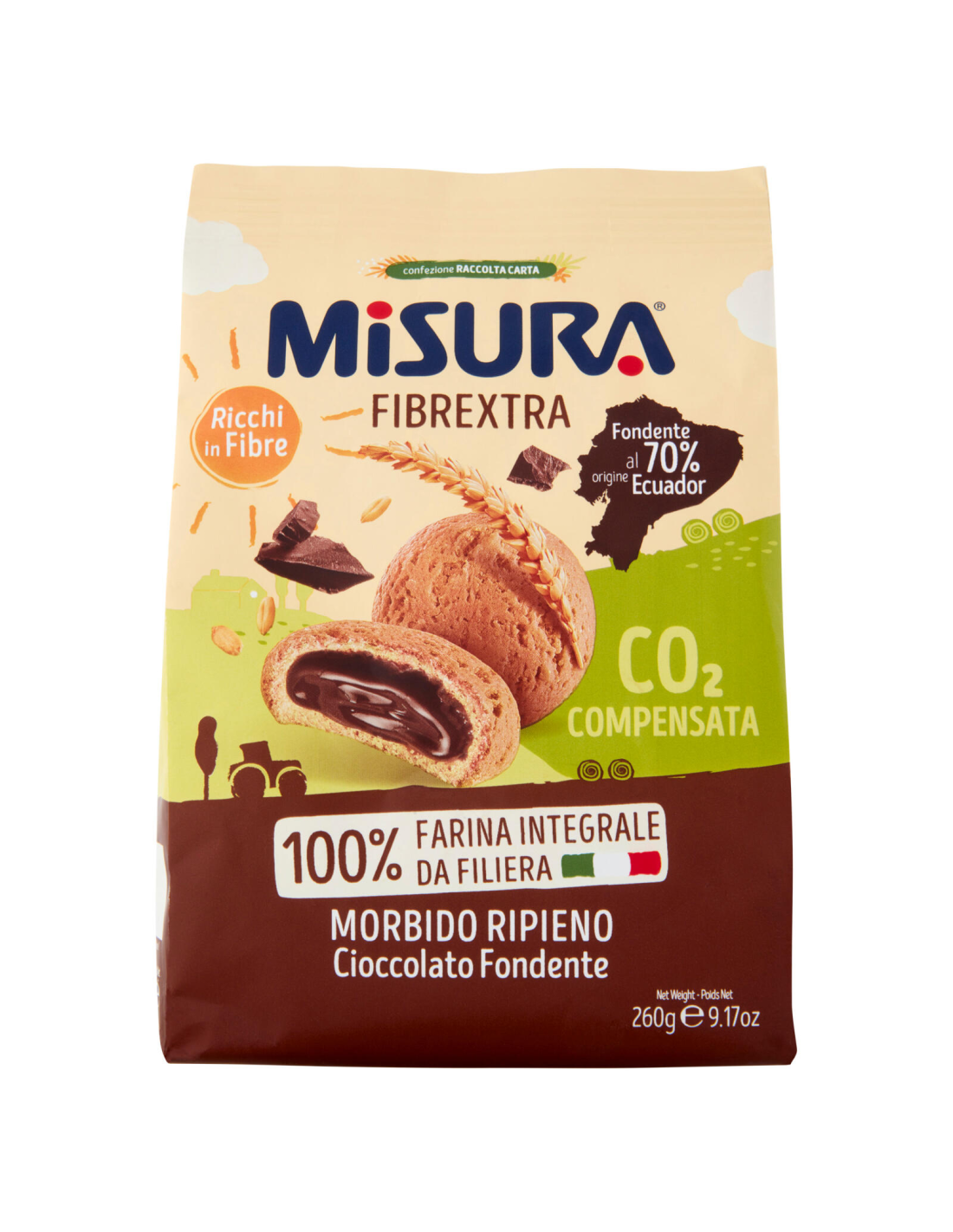 Les biscuits Misura Fibrextra avec garniture au chocolat noir sont parfaits pour ceux qui cherchent un équilibre entre goût sucré et santé. Essayez de les associer avec une tasse de café américain ou un thé vert léger ; la chaleur de la boisson mettra en valeur la saveur intense du chocolat. Pour une pause l'après-midi, essayez de les émietter sur un bol de yaourt grec pour ajouter une surprise croustillante. Ils sont également un excellent choix pour un dessert léger après le dîner, peut-être accompagné d'un verre de vin rouge léger qui contraste agréablement avec la douceur du chocolat.Ingrédients