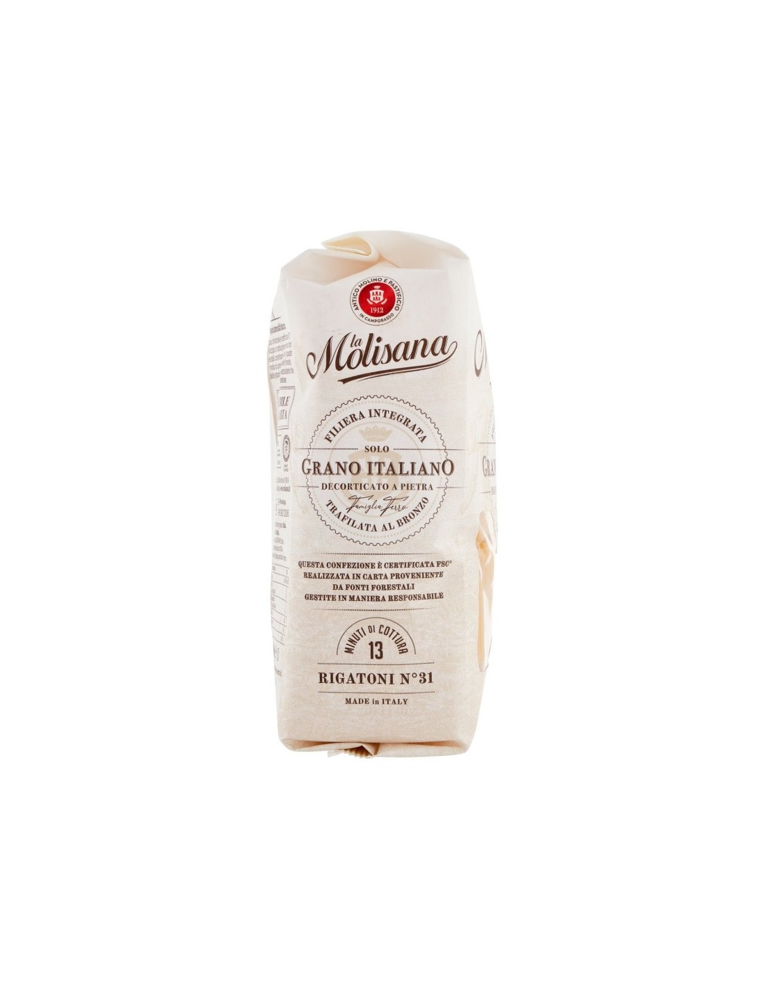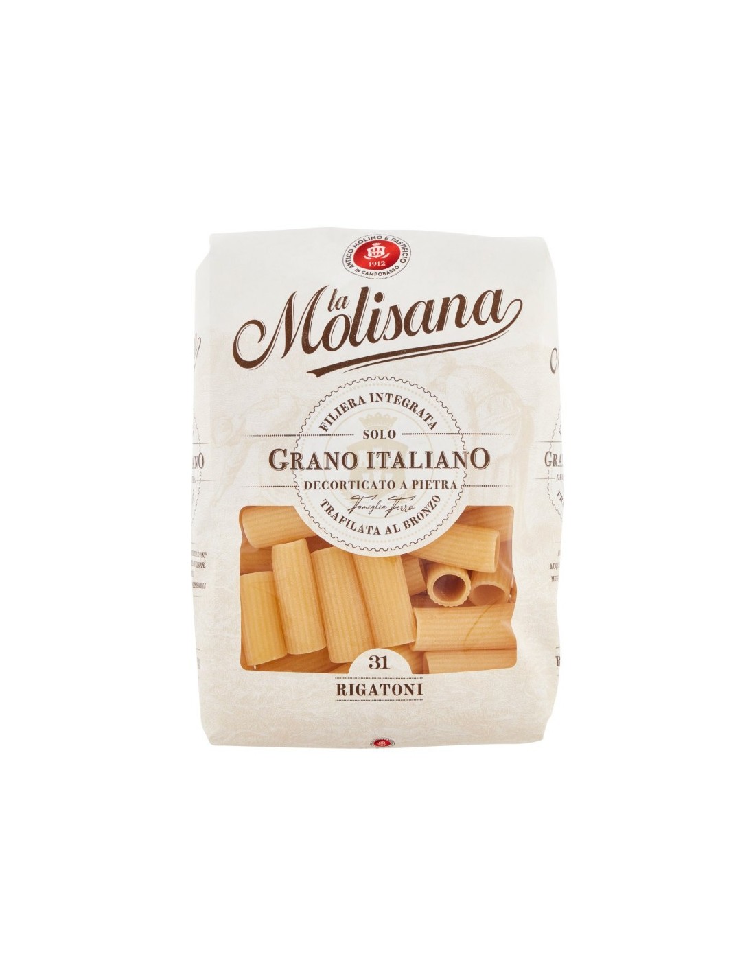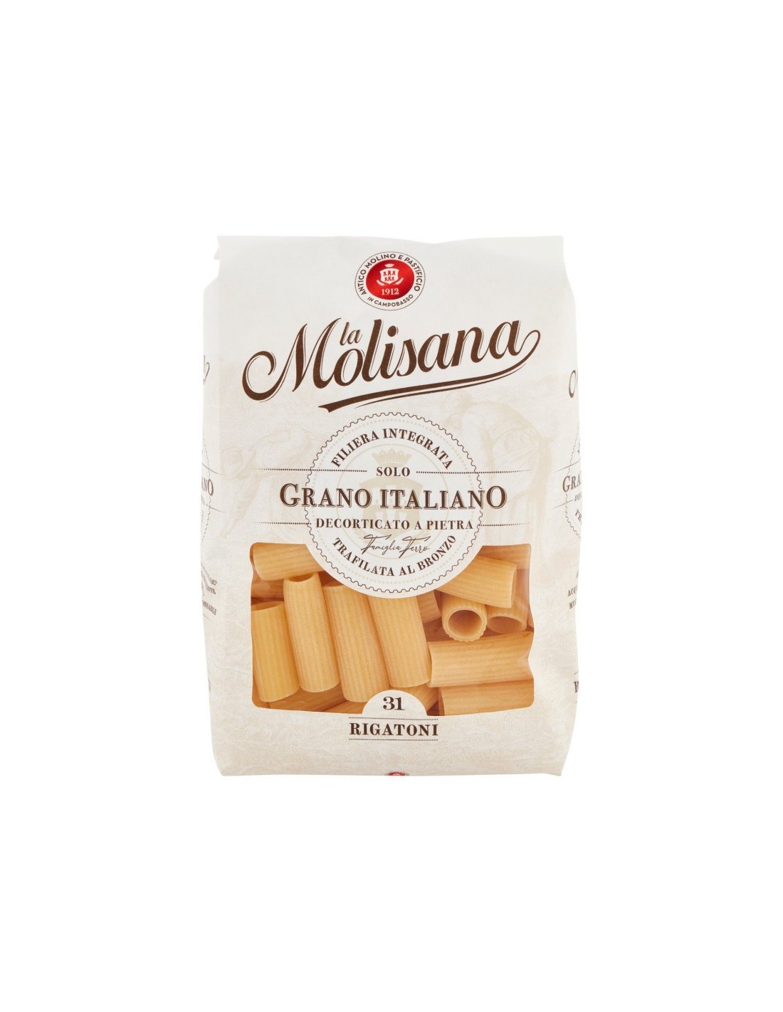 Blé débarrassé de son enveloppe par pierre, Moulin de quatre générations, Air frais de montagne et eau de source cristalline, Les meilleurs grains sélectionnés Rigatoni N°31, Filage au bronzeAllergènes