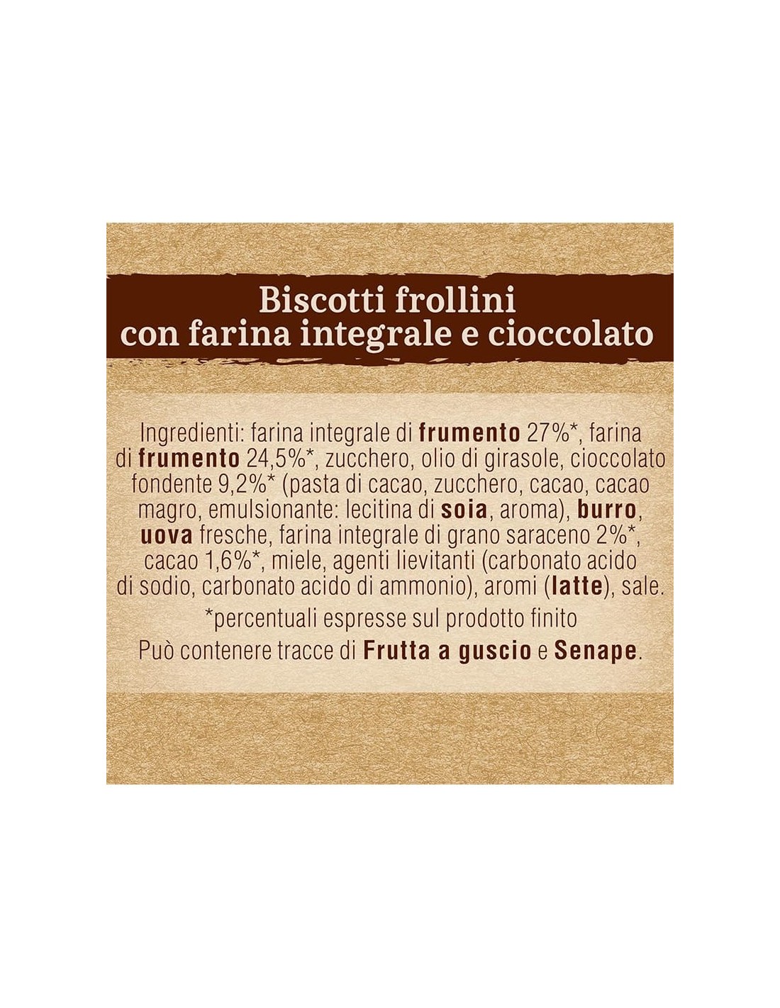 Farina integrale di frumento 27%, farina di frumento 24,5%, zucchero, olio di girasole, cioccolato fondente 9,2% (pasta di cacao, zucchero, cacao, cacao magro, emulsionante: lecitina di soia, aroma), burro, uova fresche, farina integrale di grano saraceno 2%, cacao 1,6%, miele, agenti lievitanti (carbonato acido di sodio, carbonato acido di ammonio), aromi (latte), sale.Allergeni