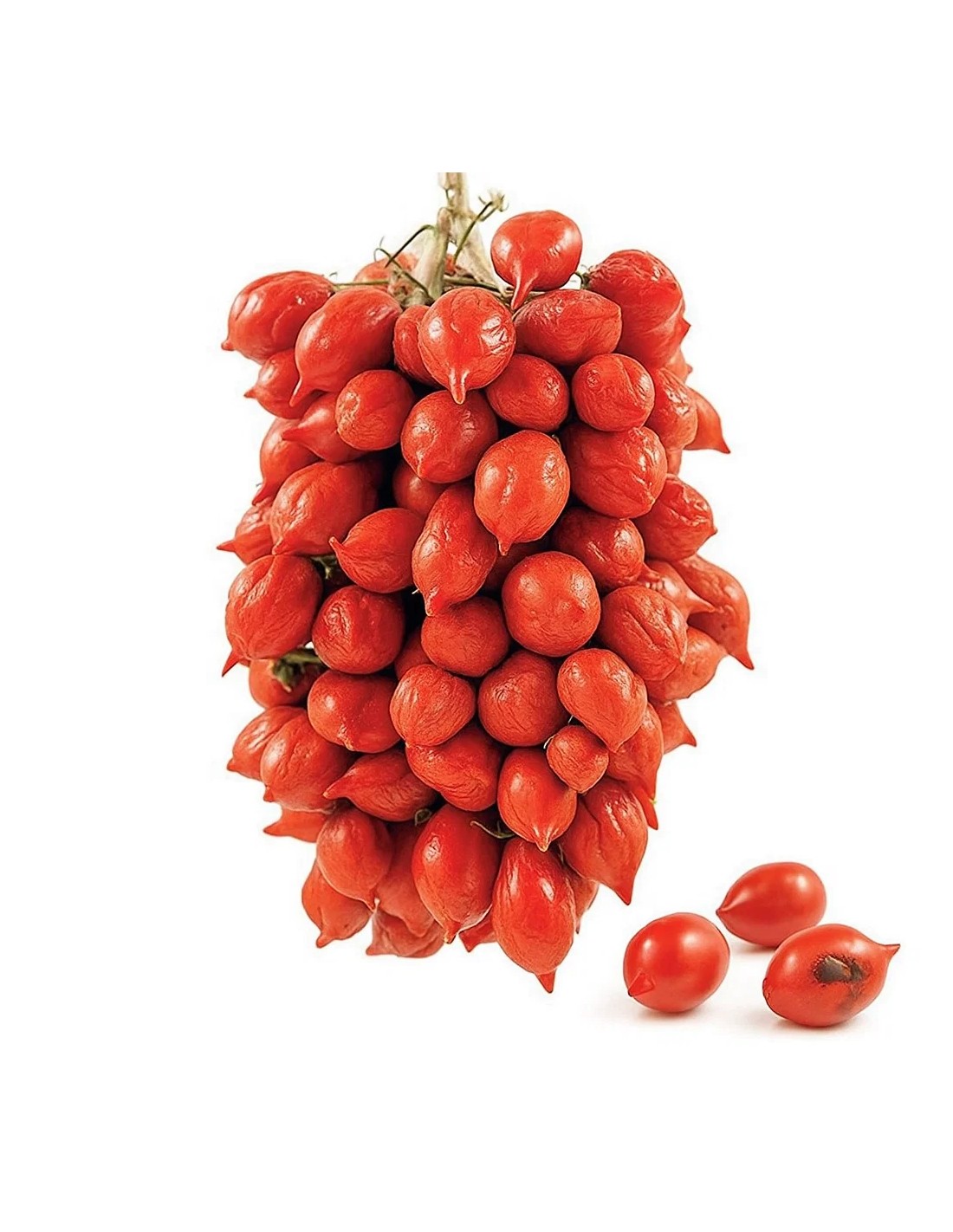 Nota importante: Il Pomodorino del Piennolo del Vesuvio DOP è un prodotto naturale a lunga conservazione, tradizionalmente raccolto a mano e intrecciato in grappoli. La buccia spessa e la naturale perdita di compattezza nel tempo sono caratteristiche tipiche di questo pomodoro. I frutti possono presentarsi leggermente raggrinziti, con qualche pomodorino staccato o piccole macchie superficiali: si tratta di segni normali che non ne compromettono la qualità. Anzi, con il passare dei mesi il pomodorino tende a perdere parte dell’acqua, concentrando ulteriormente il proprio sapore e rendendolo ancora più intenso e dolce. Se conservato in un luogo fresco, asciutto e ben ventilato, mantiene intatte le sue qualità per fino a 6–8 mesi dopo la raccolta.