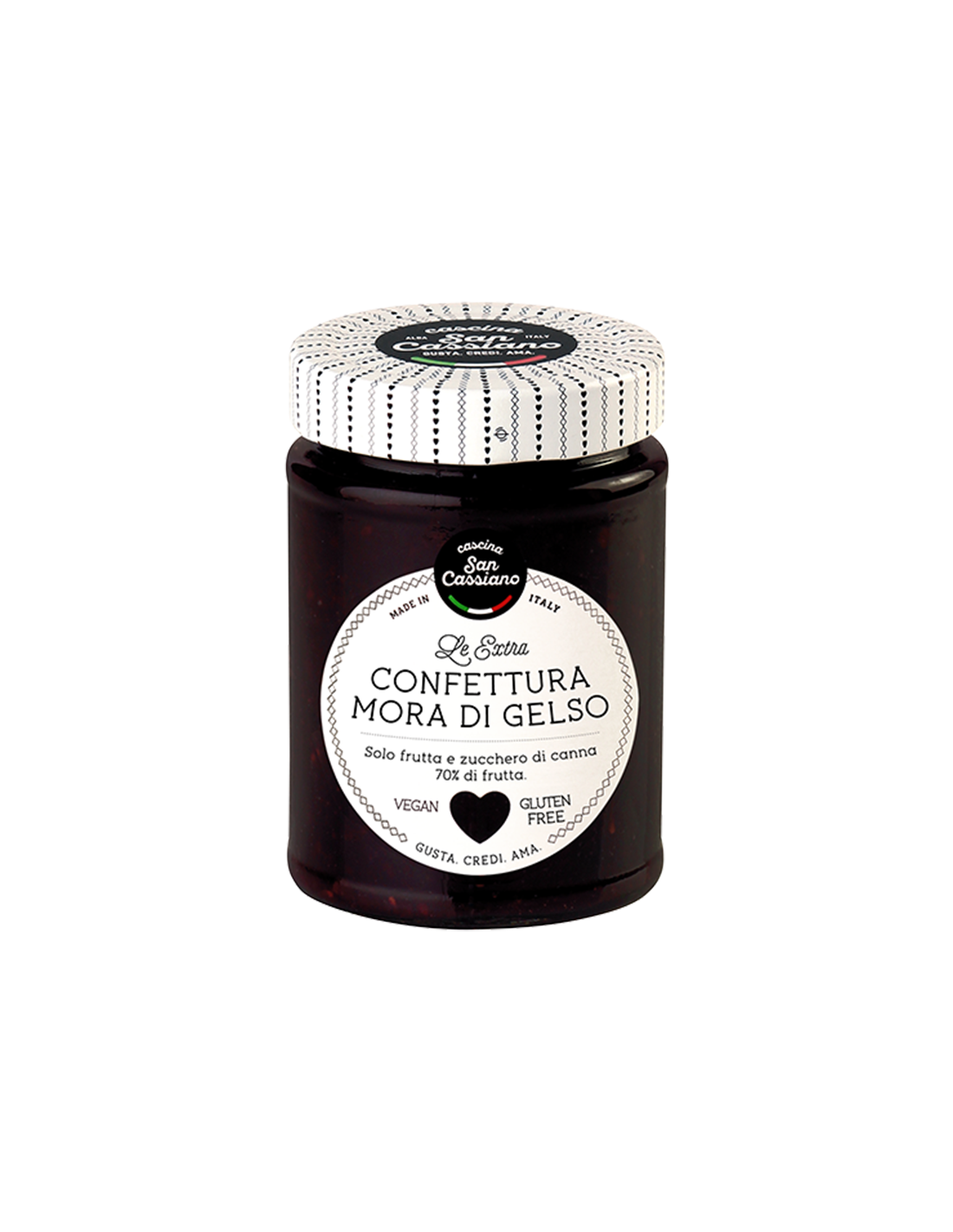 Curiosità: Le more di gelso sono il frutto di un albero un tempo coltivato per le foglie, utilizzate come foraggio principale per i bachi da seta. Questa confettura è preparata solo con more di gelso e zucchero di canna.