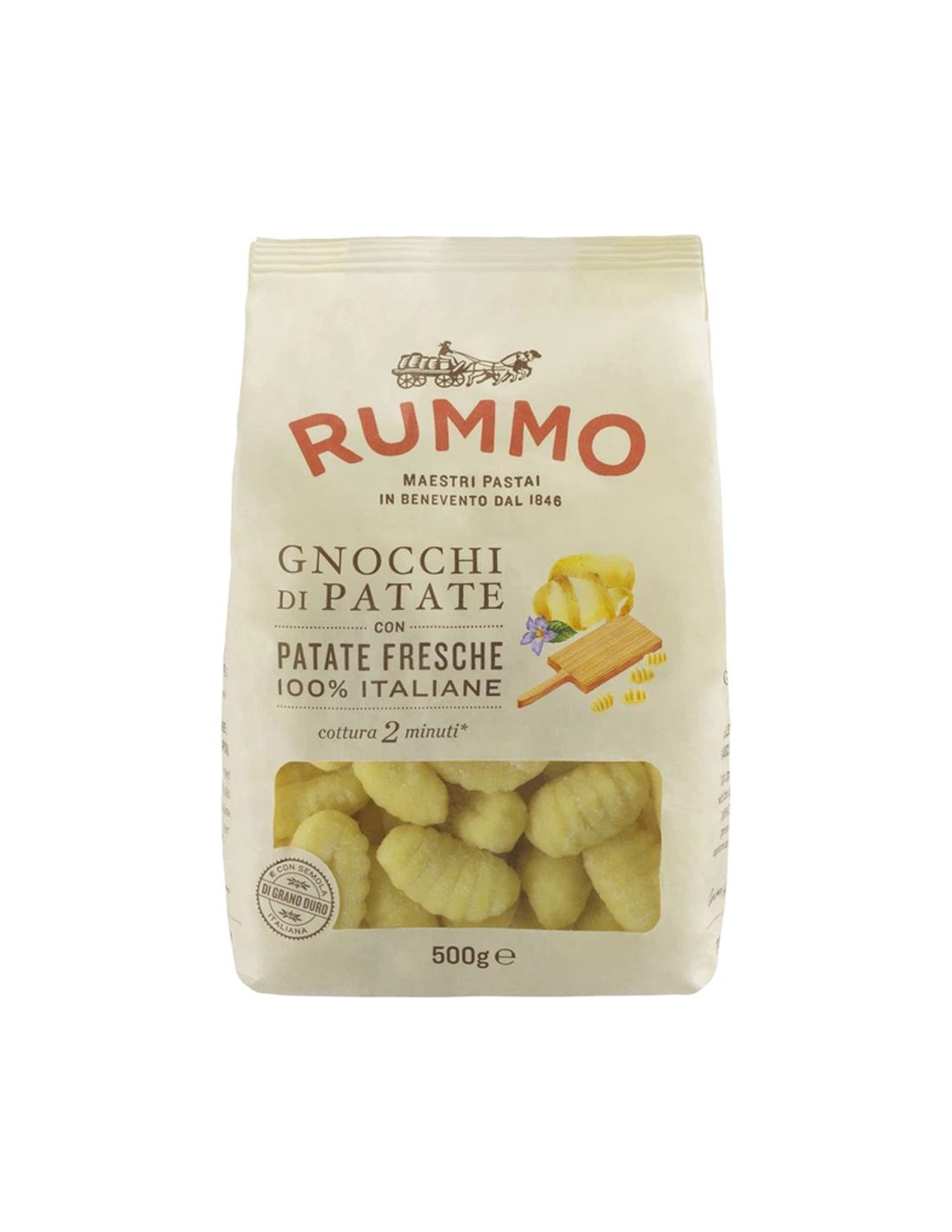 Porta la cucina italiana a casa tua con gli Gnocchi di Patate Rummo, perfetti per cene rapide ma ricche di sapore. Versatili e facili da preparare, stanno bene con una leggera burrata e un pizzico di pepe nero per un pasto cremoso e confortante. Se ami i sapori più decisi, prova a saltarli con salsiccia sbriciolata e funghi, aggiungendo del prezzemolo fresco per un tocco di freschezza. Per un pranzo estivo leggero e rinfrescante, condiscili con pesto di basilico e un tocco di limone. Un piatto sempre apprezzato in famiglia è sormontarli con burro fuso e salvia, semplicità che esalta la loro morbida consistenza.Ingredienti