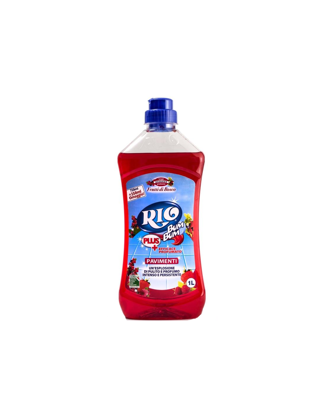 Lasciati avvolgere dal profumo intenso e dolce dei frutti di bosco del detersivo Rio Bum Bum per pavimenti. Perfetto per chi cerca una pulizia efficace unita a una fresca sensazione di naturalezza e vitalità in tutta la casa.
