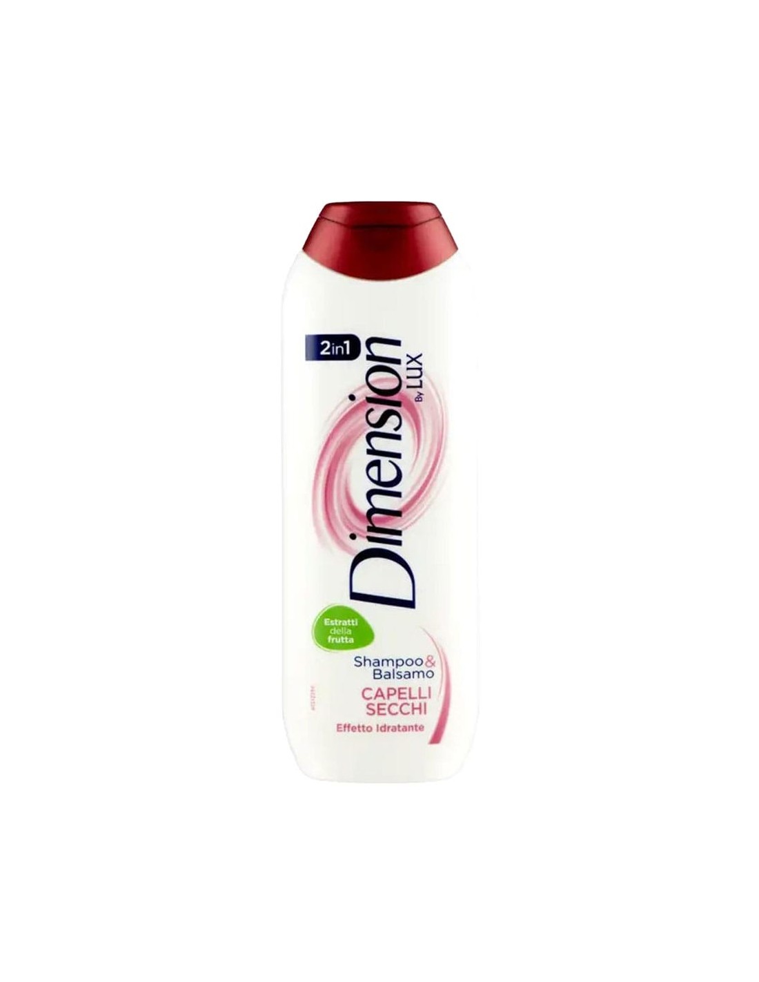I tuoi capelli sono insopportabilmente secchi e non sai cosa fare? Scegli Dimension Shampoo e Balsamo 2 in 1 Capelli Secchi, con effetto idratante e dagli estratti di frutta, quali glucosio, vitamine C ed E e acido delicato. Nutri il tuo capello dalla radice, per ridargli forza e robustezza nel tempo. E risaltane superficie donandogli volume e fluente lucentezza. Giorno dopo giorno ogni traccia di secchezza sarà scomparsa, e il tuo capello apparirà visibilmente sano e splendente. Puoi nutrire, ammorbidire e far risplendere con Dimension, in maniera efficace e delicata.