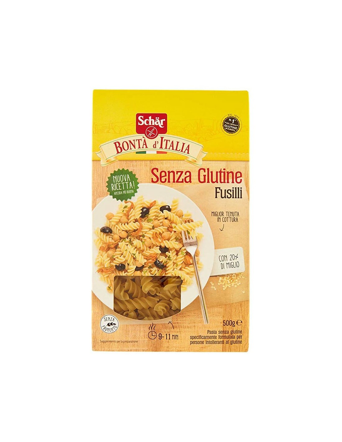 De traditionele spiraalvorm perfect om rijke sauzen vast te houden, de lichte en delicate gele kleur, de zachte en harmonieuze geur. Mis de goede smaak niet en probeer nu de Glutenvrije Fusilli van Schär: geproduceerd in Italië en samengesteld met 20% gierst. Deze oude en waardevolle graansoort geeft de pasta een evenwichtige smaak met delicate hazelnoottonen, natuurlijk glutenvrij, wiens voedingskenmerken het uniek en zeer verteerbaar maken. Een ronde en gebalanceerde smaak voor speciale voorgerechten!