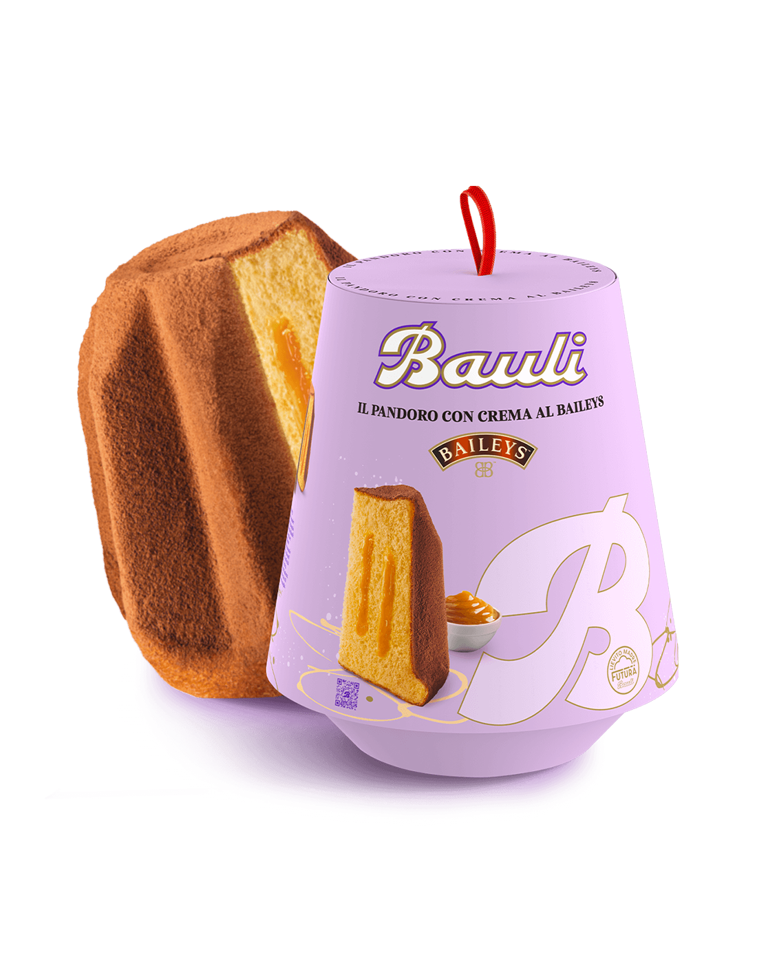 De onweerstaanbare Baileys-likeurcrème ontmoet het zachte deeg van de Pandoro Bauli: een perfecte combinatie van smaken, met een smakelijke bedekking van gesuikerde cacao.