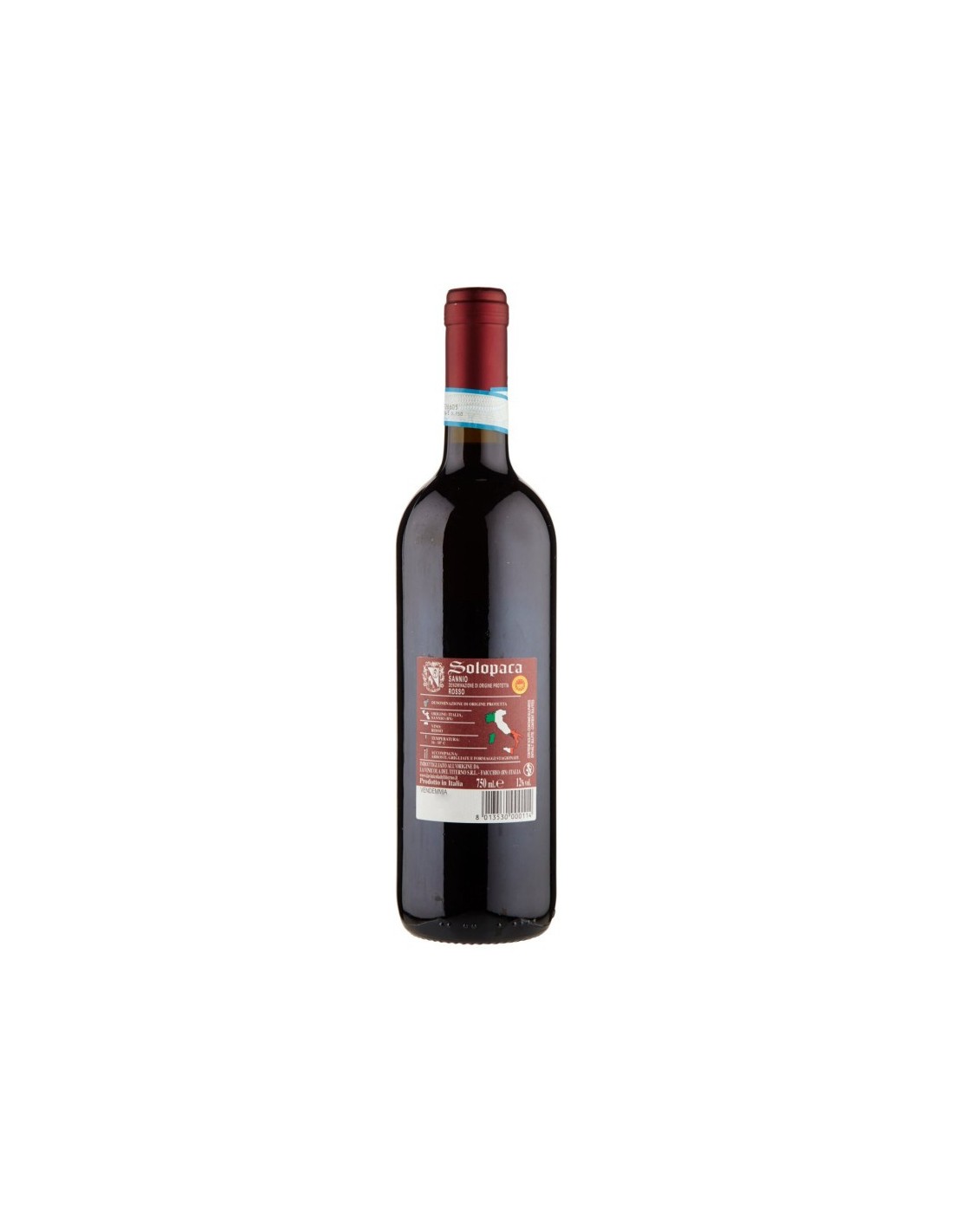 Ingrediënten: Bevat sulfieten Allergenen: Bevat Zwaveldioxide/sulfieten Solopaca Sannio DOP Rosso, Italiaanse rode wijn. Druivensoort: beschermde oorsprongsbenaming Herkomst: Italië, Sannio (BN) Kenmerken: Wijn: rood Sannio Beschermde oorsprongsbenaming Solopaca Sannio DOP Rosso, wijn uit Campanië, Italië Beschermde oorsprongsbenaming Geproduceerd in Italië Serveertemperatuur: Temperatuur: 16 - 18° C Combinaties: Begeleidt: gebraad, gegrild vlees en rijpe kazen