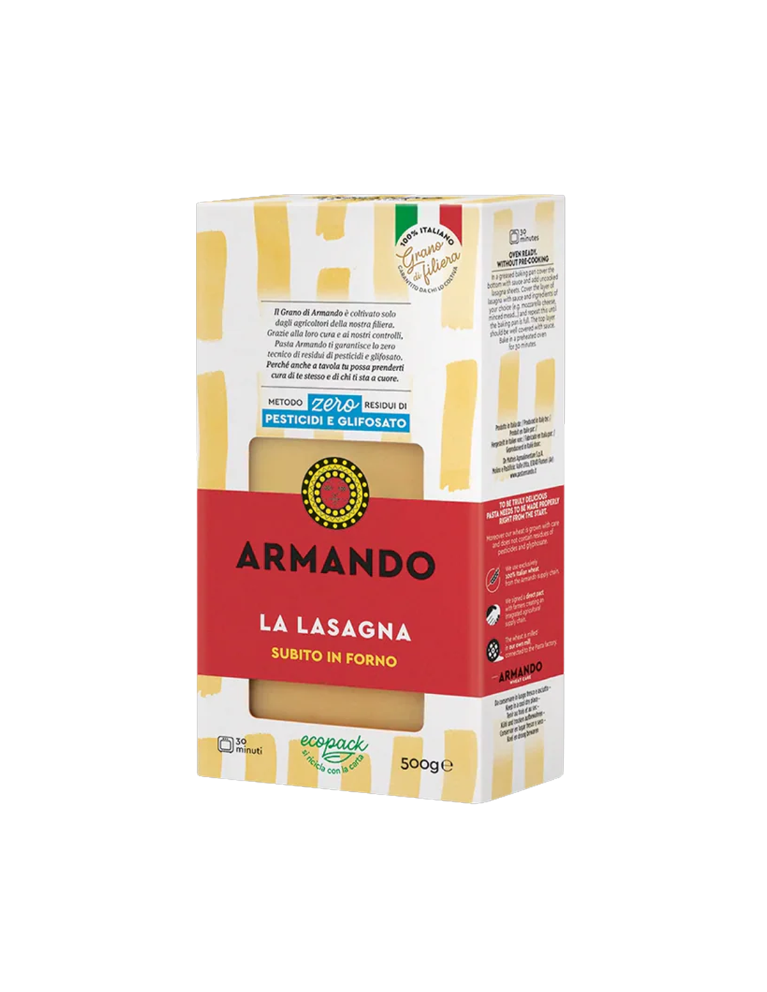 De Lasagne Pasta Armando, klaar voor gebruik, biedt een authentieke smaak, perfect voor diegenen die van traditionele smaken houden. De consistentie is ideaal voor het vasthouden van sauzen en kruiden, waardoor elke hap rijk en bevredigend is. Het is gemaakt met hoogwaardige ingrediënten, wat zorgt voor een altijd heerlijk resultaat. De pasta kookt gelijkmatig, waardoor je gerechten kunt bereiden die steeds perfect zijn.