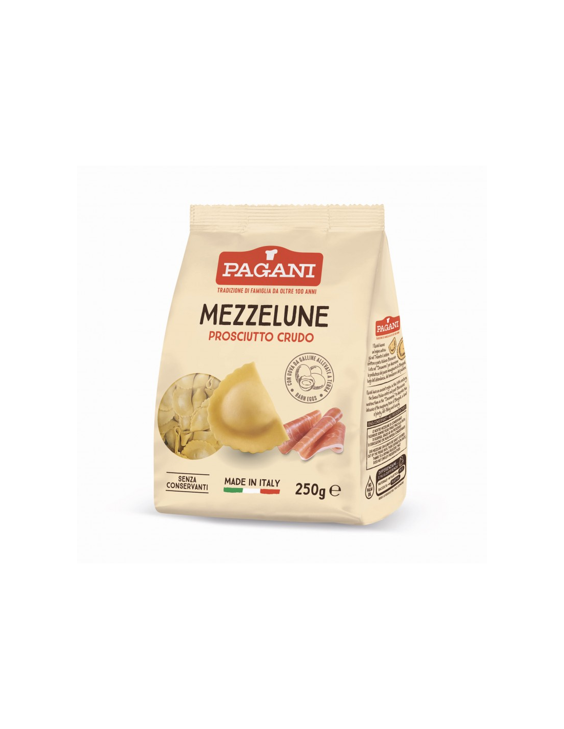 De Mezzelune met Prosciutto Crudo van Pagani zijn perfect voor een stijlvol maar snel diner. Probeer ze te serveren met een besprenkeling van vers geraspte Parmezaanse kaas om de smaak van de romige vulling te verrijken, of voor een frissere en lichtere toets voeg je na het koken een handvol verse rucola toe aan het gerecht. Een winnende combinatie zou ook een lichte bruisende witte wijn kunnen zijn die de rijkdom van de rauwe ham complementeren zonder te overheersen.Ingrediënten